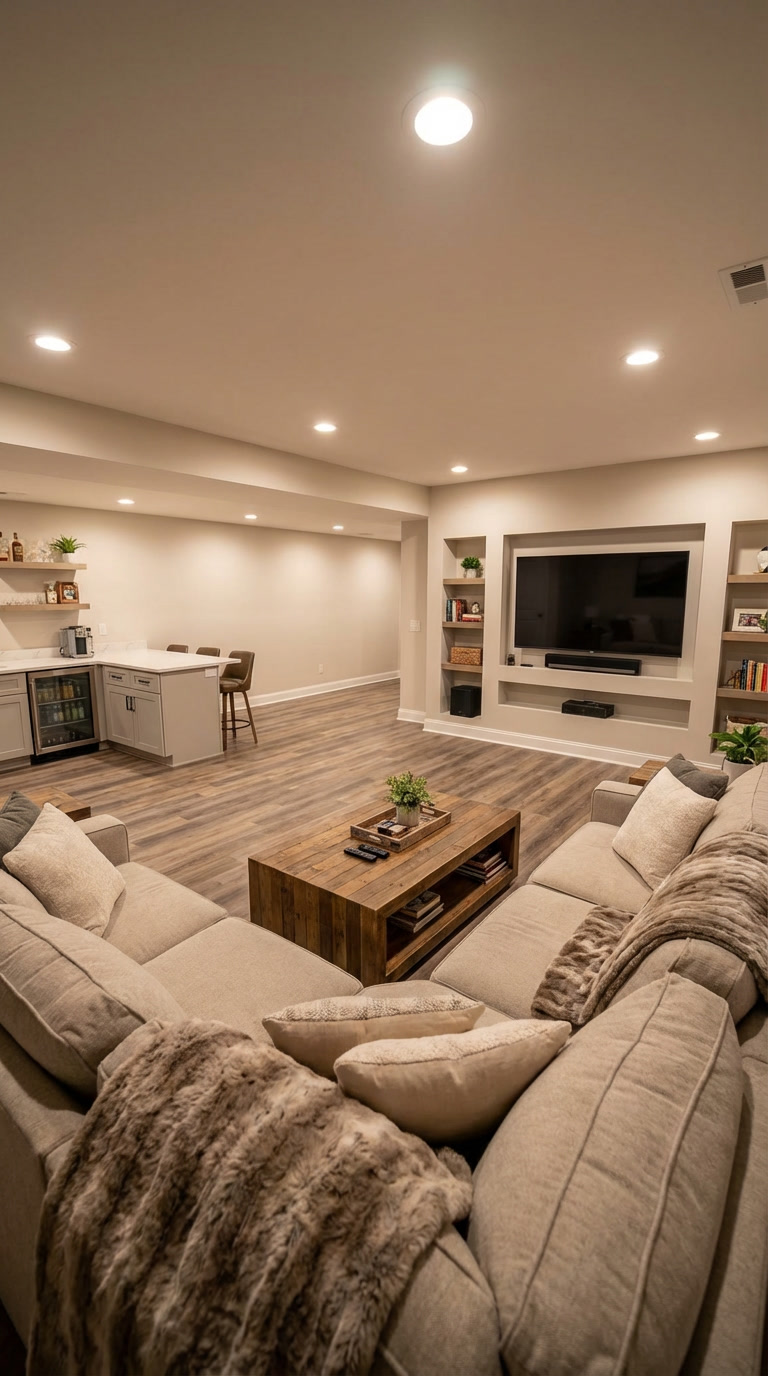 Full basement finishing in Little Falls, NJ — waterproofing, framing, drywall, LVP flooring, half-bath addition, and…