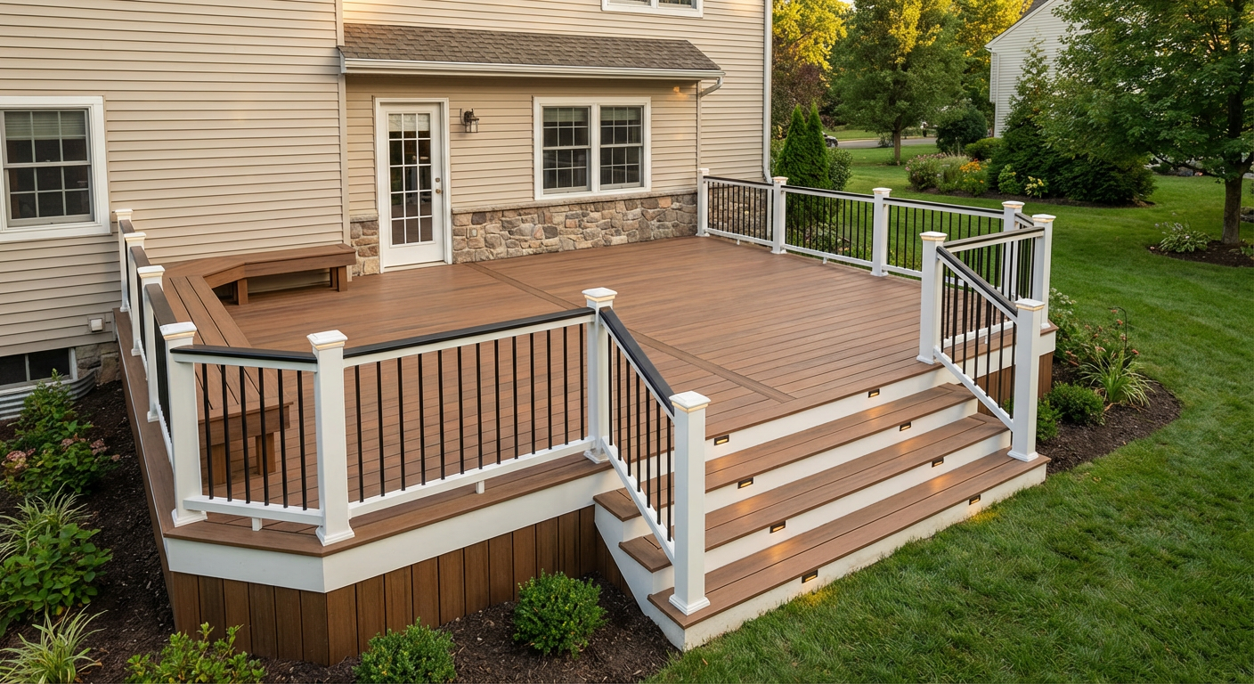 The finished composite deck is a complete transformation from the rotted lumber structure that preceded it. The Trex Transcend boards in Spiced Rum with the contrasting Vintage Lantern picture frame border give the deck a finished, designed look rather than a standard builder-grade appearance. The white aluminum railing with black balusters is clean, modern, and fully code-compliant. The built-in corner bench eliminated the need for bulky freestanding chairs in the corner and made the space feel intentionally designed. The homeowner noted that within one weekend of completion, the deck had become the primary outdoor gathering space for the family. The Trex product carries a 25-year fade and stain warranty, making the maintenance-free promise one the homeowner can hold us to.