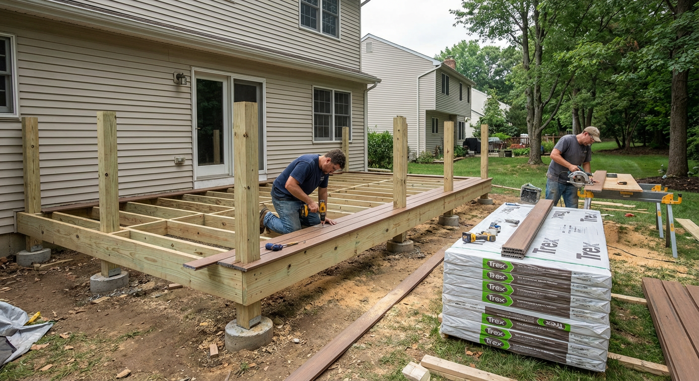 Full existing deck demolition including boards, framing, and posts. Footing inspection and verification of structural adequacy. Ledger removal, rim joist treatment and AZEK PVC repair, new ledger installation with Vycor flashing and IRC-compliant lag pattern. New pressure-treated framing at 12-inch on-center joist spacing. Butyl joist tape on all framing before deck board installation. Trex Hideaway hidden fastener installation on grooved-edge boards. Picture frame border with face-fastened contrasting board. Aluminum railing post sleeve system anchored through decking to framing. Railing assembly with black balusters and white top rail. Solar post cap installation. Built-in corner bench framing and Trex surface installation. Composite stair tread and railing system.