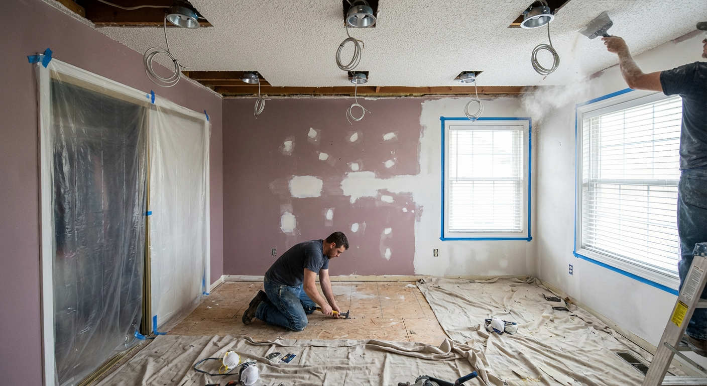 The popcorn ceiling was tested for asbestos content — results came back negative, confirming it was a post-1980 application that could be wet-scraped without hazard controls. The soft wall section near the window was opened up: we found a 12-inch section of drywall that had been wetted and never dried properly, with a small area of surface mold on the paper face. The section was cut out, the framing dried and treated with a mold-inhibiting primer, and a new patch was installed. The carpet was glued berber over a plywood subfloor — the plywood was in good condition once the carpet adhesive was cleaned off. We measured subfloor flatness and found a 1/4-inch hump at the center of the room from a slightly crowned joist, which was sanded down to within the 3/16-inch tolerance required for the floating engineered hardwood installation.