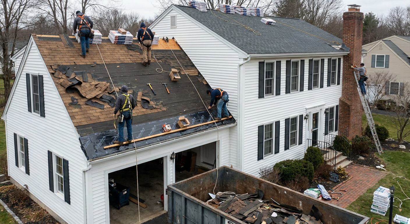 A Paramus homeowner called us the morning after a severe nor'easter tore through Bergen County, leaving multiple missing shingle sections across the front slope of their 2,400-square-foot colonial. Several ridge caps had blown completely off, and step flashing at the chimney had been bent away from the masonry, letting water directly into the attic. The homeowner had already noted a water stain spreading on the master bedroom ceiling. Our emergency tarping crew arrived the same day to prevent further water intrusion, and a full scope inspection was completed the following morning. The assessment confirmed what the homeowner feared: the roof was 22 years old, the original asphalt shingles were at end of life, and the storm damage had accelerated the inevitable. Exterior Solutions LLC performed a complete tear-off and full replacement with GAF Timberline HDZ architectural shingles, new synthetic underlayment, ice and water shield, and a fully integrated leak barrier system.